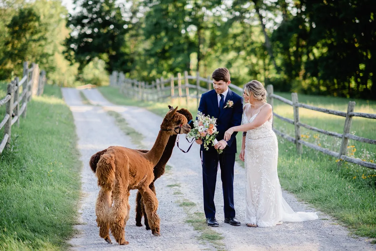 Host your intimate wedding with on-site lodging for 25 guests. Rustic farm setting with unique alpaca photo opportunities.